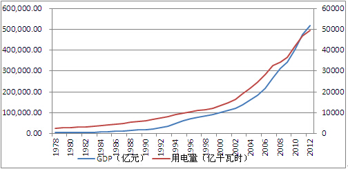 1978年,中国全年GDP产值0.36亿元,而至2012年年底,中国GDP产值达到51.89万亿,增长143.14倍。中国经济的高速增长催动用电量的增长,1978年,中国全社会用电量2497亿千瓦时,而至2012年,中国全年用电量达到49591亿千瓦时,增长18.86倍。用SPSS作社会用电量与GDP的关系数据,我国1978年~2012年社会用电量与GDP曲线走势一致性很强,其强相关性为0.994,随着中国经济的继续高速发展,社会用电量仍将增长。