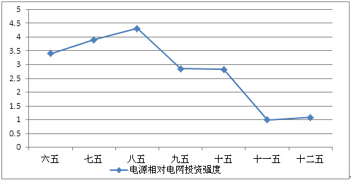 而在电力系统内部投资结构上,电源、电网投资在不同时期,投资差异很大,“六五”时期,国家电源投资总额211亿元,而电网投资总额62亿元,分别占投资比重的77.29%和22.71%;“七五”期间,电源与电网的投资比重分别为79.62%与20.38%;而至“十二五”期间(规划),电源与电网的投资比重分别为51.89%和48.11%。